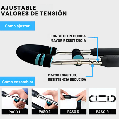 No necesitas accesorios adicionales. El kit de IRONBAND PRO™ viene con todo lo necesario (bandas de resistencia, anclajes de puerta y agarres) para realizar cientos de ejercicios. Se instala y desinstala en segundos utilizando una puerta o una estructura fija, convirtiendo cualquier espacio de tu casa u hotel en un gimnasio funcional.